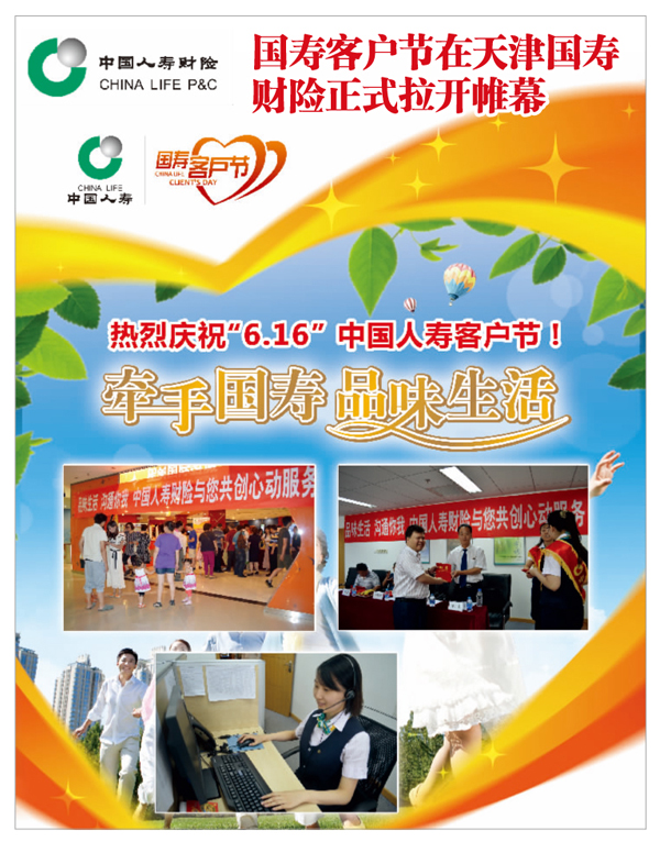 中国人寿财险天津市分公司在6月15日正式启动国寿客户节,开启了2012年“牵手国寿,品位生活,从心开始,沟通你我”的客户节之旅。客户节活动中,中国人寿财险天津市分公司邀请在媒体上招募的20名保险社会监督员近距离感受公司服务,邀请400名优质客户观看震撼3D电影《马达加斯加》,进行客户大回访来征集客户建议。(中国人寿财险天津分公司)