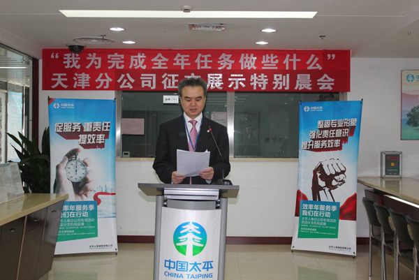 为深入贯彻落实太平人寿总公司“效率年服务季我们在行动”活动要求,积极响应总公司的号召,天津分公司面向全体内外勤员工开展了“我为完成全年任务做些什么”主题征文活动,且由总经理室和各部门经理充分发挥带头作用,率先撰写征文。从9月4日开始,天津分公司的内勤晨会中增设了一个新的栏目,即“我为完成全年任务做些什么”征文活动展示专栏,由总经理室领导和各部门经理进行征文发表。截止发稿时,分公司共收到征文90余篇,总经理室领导和11位职能部门经理均已在晨会上进行了征文发表,各系列、各部门经理纷纷结合各自职能、当前业务发展情况,表达了完成全年任务的决心和具体工作举措,前后线相互支持、相互配合,共同为完成全年任务而努力奋斗。