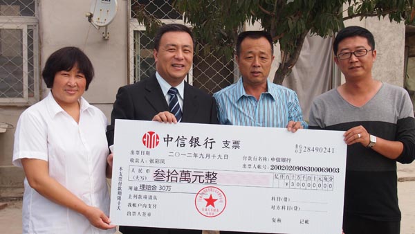9月19日,信诚人寿天津分公司总经理贾宏伟先生专程到叶先生的公司送去30万元理赔款并表示慰问。叶先生深有感触地说:“当初购买信诚人寿的团体意外险只是因为和贵公司的营销员认识,没想到这回保险真帮了自己的大忙,我只缴了600多元的保费却收到了信诚人寿30万元的理赔款。我要感谢信诚人寿主动快速全方位的理赔和服务,这也让我充分体验到保险保障的真谛和大爱!”(信诚人寿天津分公司)