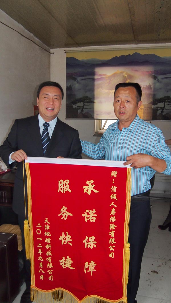 日前,天津某公司的总经理叶先生向信诚人寿天津分公司赠送了一面锦旗:“承诺保障,服务快捷”。