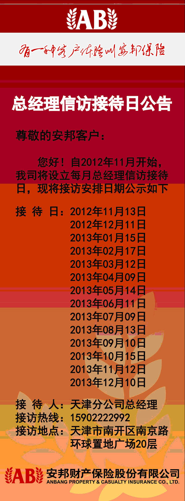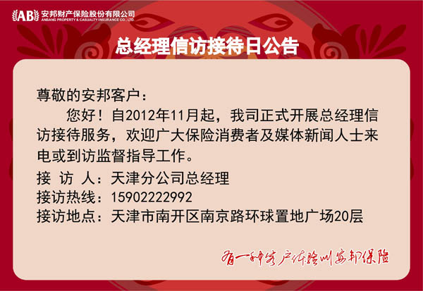 依托2012年中国保监会“抓服务、严监管、防风险、促发展”的监管思路下,安邦财险天津分公司秉承着天津监管局不断提高保险服务质量和水平的重要工作指示,在分公司总经理的带领下,对公司承保、客服、理赔等重要服务环节进行了全面的梳理,提出将信访工作作为稳定服务大局促进公司发展的重要服务内容,狠抓服务质量。自2012年11月开始执行总经理信访接待日制度,由分公司总经理室负责人亲自接听并处理客户投诉,及时、快速、妥善解决客户相关问题,公开听取,主动接受保险消费者、新闻媒体、行业协会及各类监管单位提出的意见与建议,将行之有效的减少投诉,提升客户满意度作为根本目标。