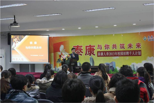 11月27日,泰康人寿天津分公司2013年千人计划校园招聘宣讲会在天津财经大学成功举行。会议现场座无虚席,气氛活跃,累计收到应聘简历近150余份。