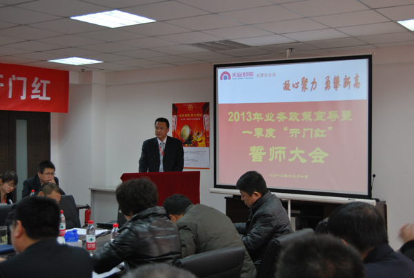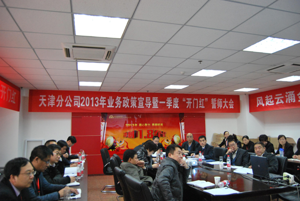 12月10日下午,天安保险天津分公司召开2013年业务政策宣导暨一季度开门红誓师大会,分公司总经理室成员、各业务部门经理助理以上负责人、各管理部门负责人及处室负责人共29人参加了会议。