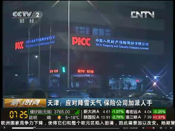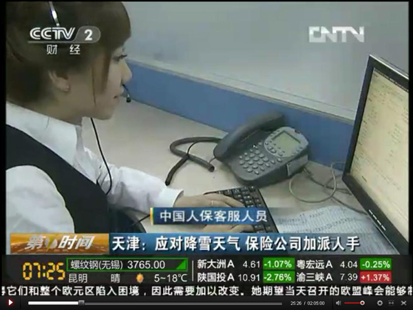12月14日上午7:25,央视2套《第一时间》节目即播放了天津市分公司应对暴雪天气积极启动紧急预案的详细情况,节目时长约3分钟。