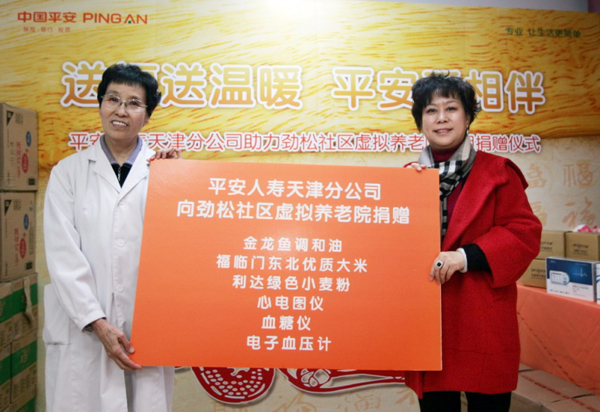 为帮助护养院改善医疗条件,以更好地为社区老人进行保健和康复指导服务,此次分公司特别购置了心电图仪、血糖仪和电子血压计等医疗设备。品牌总监王伟代表分公司将这些医疗设备捐赠给第二劲松护养院,同时表示保险的核心精神就是爱与责任,多年来分公司始终胸怀强烈的社会责任感,连续十二年开展公益献血活动、援建资助蓟县平安希望小学、坚持开展“大学生励志计划”、捐资助老等各类公益慈善活动,作为天津市场上的优秀企业公民,分公司有责任贡献一己微薄之力,向社会传递大爱的正能量。为了感谢和弘扬平安的善举,劲松护养院也向分公司赠予了荣誉证书及纪念奖杯,并号召更多的爱心企业以平安为楷模,以自身的实际行动共同促进社会公益事业的发展。另外,为让社区困难老人们度过一个安定祥和的新春佳节,分公司在劲松护养院工作人员的带领下,将米、面、油等年货一一送至该社区30户困难老人家中,并送上平安的新春祝福与问候。受助老人们激动万分,纷纷表示这些物品不仅能让他们过一个快乐的春节,同时更让他们体会到了来自平安的一份真情和整个社会的关爱。