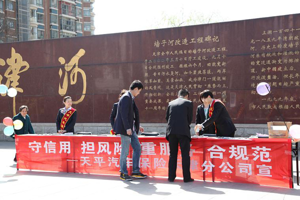 为了把保险行业核心价值理念的学习宣传贯彻工作真正落到实处,使保险行业核心价值理念在社会深入人心,天平保险天津分公司总经理室积极筹划,组织分公司业务骨干于4月18号下午2:00在津河广场开展保险知识宣传活动,以天津市保险协会印发的“明明白白买保险”宣传手册为载体,向社会群众宣传保险知识。结合群众需求发放介绍天平车险产品、理赔服务、增值服务等内容的宣传彩页,通过员工专业的保险知识讲解,充分展现天平保险企业风范,普及了天津市民的保险知识。此次广场保险知识宣传活动是贯彻保险行业核心价值理念的具体体现。(天平保险天津分公司)
