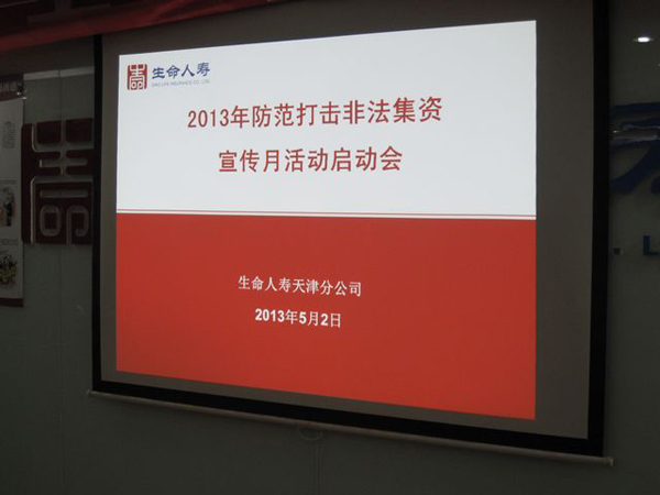 根据《关于开展2013年天津保险业防范打击非法集资宣传月活动的通知》(津保监发〔2013〕23号)的文件要求,按照天津保监局的统一部署,生命人寿天津分公司于5月2日正式启动全辖范围内防范打击非法集资宣传活动。