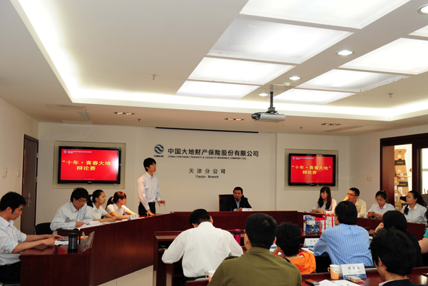 在中国大地保险公司成立十周年之际,为进一步激发青年员工的责任感和使命感,引导员工将公司发展目标融入到个人发展中来,天津分公司团委举办了“十年·青春大地”辩论赛。本活动得到了各团支部积极响应,共有六支辩论队参加了比赛。辩论赛分三场进行,辩论正方观点为“只有公司发展,才有个人发展”,反方观点为“只有个人发展,才有公司发展”。赛场上,各队博古论今、谈文言商,以大量论据和事实积极攻辩,展现了天津大地广大团员青年积极向上、思维敏捷和求知好学的精神风貌。