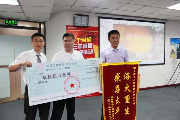2013年6月3日,刘先生拄着双拐赶到了公司,将特别制作的“浴火重生感恩太平”锦旗,亲手献给了分公司领导。刘先生说,遭遇这么大的事故,使自己的身体遭受巨大的痛苦,同时使家庭的经济遭受了巨大的损失,是不幸的,然而,自己是不幸中的幸运儿,因为自己购买了充足的保险。而且通过这次快速的理赔,自己深切地感受到了太平的温暖。刘先生还激动地说,太平人寿是一家非常优秀的保险企业,希望自己能够加入太平大家庭,将这份爱心传递下去。