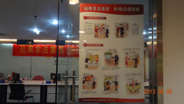 2013年5月,光大永明人寿保险有限公司天津分公司开展了主题为“远离非法集资,拒绝高利诱惑”防范和打击非法集资宣传月活动。此次活动公司领导高度重视,指示宣传活动要采取悬挂宣传标语、发放宣传手册、制作课件集中培训和通过E-learning学习平台考试等多种方式进行。通过宣传和培训使公司内、外勤员工掌握了非法集资知识,了解了非法集资的危害和法律后果。同时为了提高社会公众的自我保护能力,公司还特别在客服大厅设立了防范非法集资宣传坐席,接待客户有关非法集资方面的咨询。此次宣传活动,使广大员工和社会公众认识到应自觉远离非法集资陷阱,遏制非法集资犯罪活动蔓延,活动起到了良好的教育和警示作用。(光大永明人寿保险有限公司天津分公司)