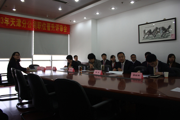 2013年4月24日,泰康人寿天津分公司职位晋升评审会顺利召开。此次会议得到了分公司总经理室的高度重视和大力支持,总经理室成员、县域发展部经理郭跃峰、客户服务部经理左志华作为评委出席评审现场,人力资源部经理么洁作为HR观察员一同出席,来自各部门、各机构的18名伙伴参加了本次职位晋升评审会。
