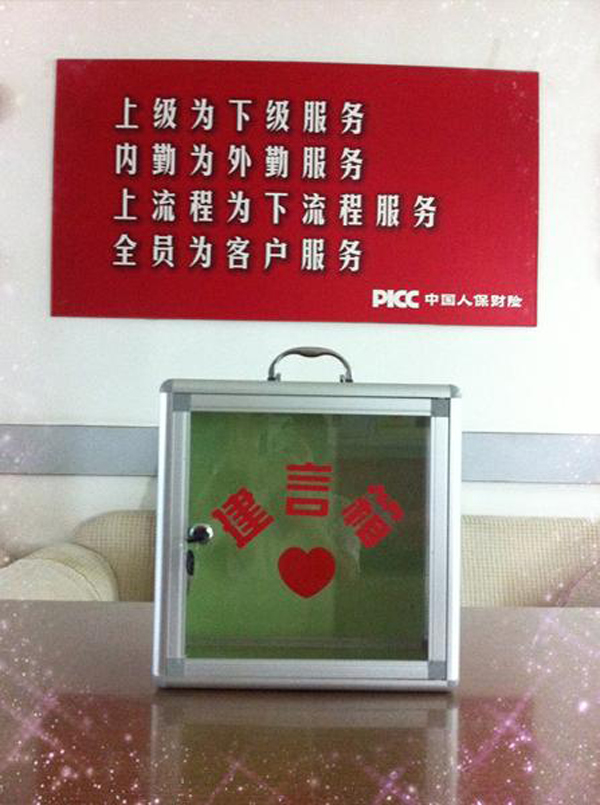 本次建言箱的设立可以直面一线员工工作中的问题,充分体现精细化管理,有利于提高员工的软实力,激励员工的工作的热情,使业务流程简单化、合理化、规范化,为一线员工提供全方位的人性化管理。同时,也会使一些有思想有能力有发展的员工得到重视,用这种了解和信任架起选拔的桥梁。(人保财险天津分公司)