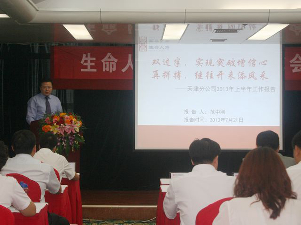 分公司总经理范中刚进行题为“双过半、实现突破增信心;再拼搏,继往开来添风采”的半年工作报告。报告全面回顾了天津分公司上半年工作情况,从八个方面总结并肯定了半年来取得的亮点与成绩。范总讲到,2013年是天津分公司持续做实、努力做优的重要经营年度。在总公司整体工作思路领导和支持下,在监管部门的指导下,在总督导杨宝义总的督导鼓励下,天分全体员工紧密围绕张峻董事长提出的“明确目标、优化管理、真抓实干、勇于创新”的工作思路,坚持“精细管理和改革创新”的经营理念,坚持“算账经营和稳中求进”的价值导向,坚定信念凝心聚力,全面强化成本管控,积极推进结构调整,尽管面临诸多挑战,依然强势开局,主要渠道保费增长显著,实现“时间过半、任务超半”,各项业务和管理水平取得较好的成绩,业务发展、市场地位、管理水平得到了较大的提升。