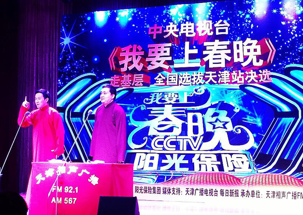 本次《我要上春晚》走基层全国选拔得到了阳光保险集团、天津相声广播FM92.1、每日新报、西岸相声会馆、天津电视台《都市报道》的大力支持,不仅为年轻的相声演员提供了展示自己的平台,更使“春晚”这一神圣的舞台走进了千家万户百姓的生活中,为普通老百姓实现自己的“中国梦·春晚梦”开辟出了新途径!阳光保险集团作为《我要上春晚》栏目连续3年的独家冠名企业,在此次决选活动中与央视深度合作。(阳光人寿天津分公司)