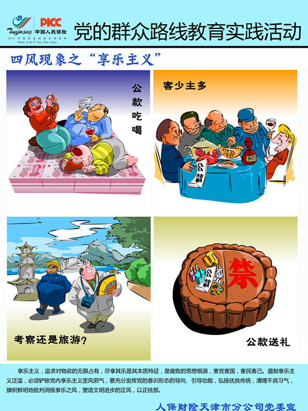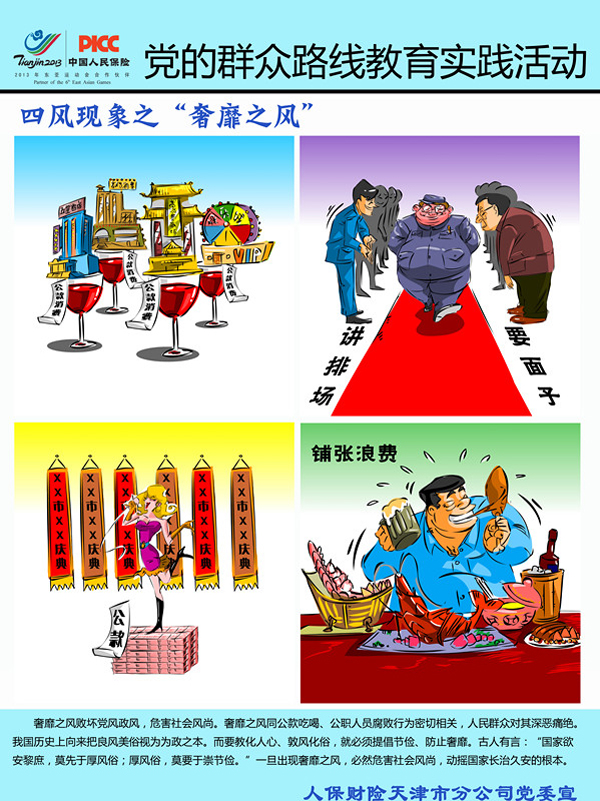 漫画宣传海报围绕揭露不求实效、文风会海的形式主义、高高在上、脱离群众的官僚主义、公款吃喝、客少主多的享乐主义和铺张浪费、讲究排场的奢靡之风等四风现象,大力弘扬艰苦奋斗大力弘扬求真务实的工作作风,弘扬密切联系群众的工作作风,弘扬开拓进取的工作作风,弘扬勤俭节约、艰苦奋斗的工作作风,使教育实践活动宣传信息及时到达每一名干部员工。