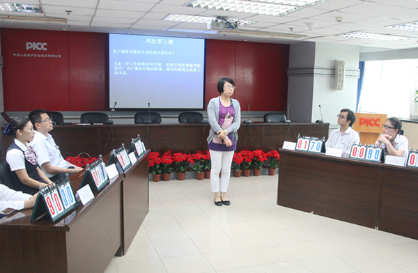 比赛内容涉及交强险、机动车商业保险、服务礼仪、出单、保费计算、财产险等相关险种条款及业务承保规定等,并在现场答题环节设立了必答题与风险题两个环节,风险题中不但有大堂经理本职工作的题目还有涉及本职以外其他各环节流程与规定。比赛过程中每位选手积极答题,不但展现了各自对本职业务的熟练程度,也表现出对其他环节工作流程与规范的熟悉,真正表现出了一名大堂经理应有的素质与技能。