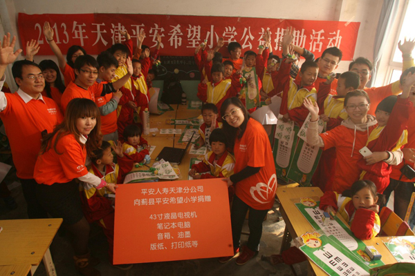 10月18日,平安人寿天津分公司2013年蓟县平安希望小学电教设备公益捐助活动正式启动。此次,分公司全体内外勤员工捐款5万余元购买液晶电视、笔记本电脑、音箱、油墨、纸张等电教设备及教学耗材用于提高学校电教化水平,并及时补充学校所需的教学耗材。本年度礼仪之星和兼职通讯员以及蓟县支公司部分外勤同仁参与此项活动,共同表达全体平安人对孩子们的关爱与问候。