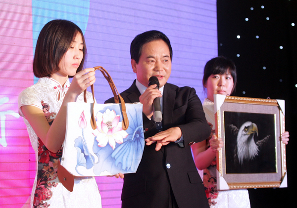 第三篇章是整个公益庆典活动的高潮,由每日新报社会新闻部主任金莹向大家讲述了十八年来与病魔斗争,自食其力的一位肌无力患者——王佳的故事。在短短五分钟的故事中,金莹几次哽咽,与会人员也被感动得纷纷落泪。随后,王佳和她母亲登上舞台,在王佳坚定有力的话语中,让与会人员看到了一个意志坚强的女孩。接下来,应主办方的要求,王佳带来了她的三件作品进行现场拍卖。一个镶满了水钻手机壳,一个手绘的挎包和一幅鹰头的画作。三件精美的作品在舞台上刚一亮相就受到了大家的喜爱。手机壳的竞价从200元起拍,一路飙升,最终以1000元的价格被大安房地产有限公司总经理陈建国收入囊中。手绘荷花挎包以400元底价拍卖,最终由赵福荷家属全力拿下。最后的一幅山鹰画作起拍价为1000元,也被一名客户以3000元的价格拍得。