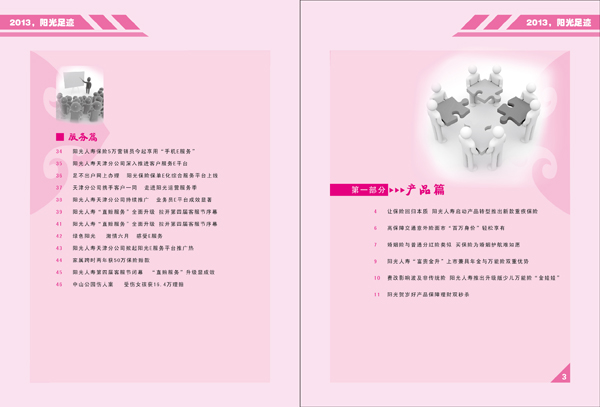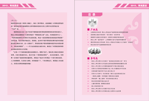 第四部分为彩页宣传篇。通过大幅彩色图片对2013年阳光天分年度大事件进行宣传,第四届客户服务节的隆重启动、趣味登山活动的开展、五周年公益庆典以及“阳光爱心商城”捐助活动,四幅彩页记录了阳光天分2013年的成长。