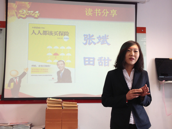 2014年伊始,总经理于燕将内勤员工举办的读书分享会推广到全体银保客户经理中。一季度推荐书目是由理财专家刘彦斌撰写的《人人都该买保险》,旨在帮助客户经理了解人寿保险的真正意义,树立“理财,必须买保险”的观念,坚信保险能为每个家庭幸福和生活安康保驾护航。通过阅读及分享,伙伴们从各自的角度诠释了保险的意义,有的从财富管理角度,有的从风险管控角度,有的从财富传承角度,分享了自己的读书感悟。