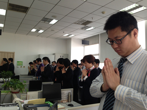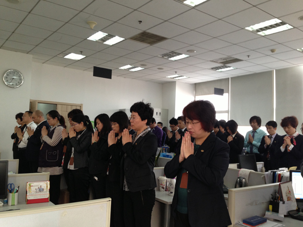 3月10日,阳光人寿天津分公司召开特别晨会,为失联的马航上的乘客祈福,所有员工双手合十,心中默念:期盼奇迹,平安归来!(阳光人寿天津分公司)