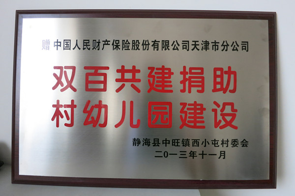 通过捐助,村办幼儿园的环境和基础设施得到了巨大改善,分公司捐助得到了村民、镇政府和县政府的高度认可和评价,静海县中旺镇西小屯村委会特向分公司赠予“双百共建捐助村幼儿园建设”牌匾。(人保财险天津市分公司)