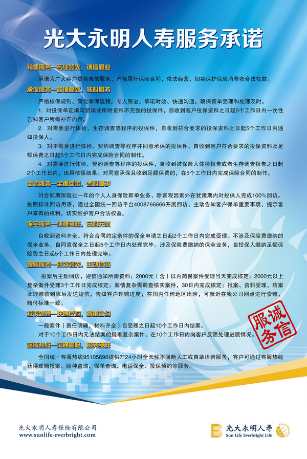在分公司职场内及所辖营业场所内张贴《服务承诺》、《客户咨诉处理须知》及放置《服务365》展架等等,公开公司各项服务承诺。