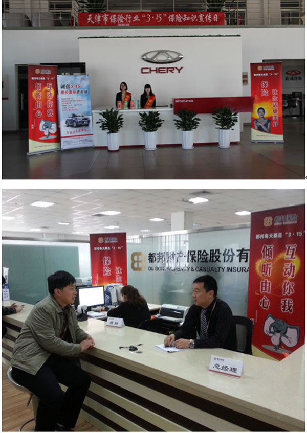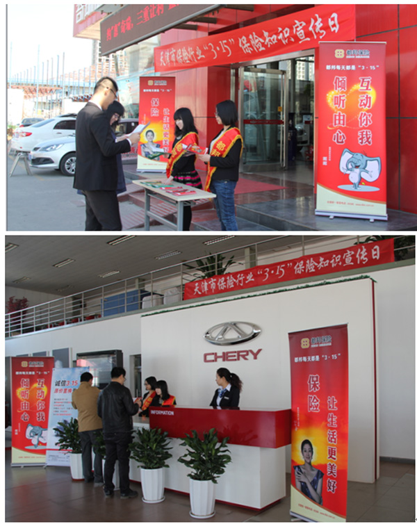 3月20日,公司分别在分公司前台以及天津“博瑞祥通”奇瑞4S店组织开展了“保险,让生活更美好”保险宣传日活动。在活动中,公司人员积极向客户、消费者、包括路人等积极发放宣传品,讲解保险知识,提供产品咨询等服务。公司业管、理赔部门及营业部人员准备了车险、财产性、意健险等多种宣传手册,在活动场地悬挂了《保险,让生活更美好》、《天津市保险行业“3.15”保险知识宣传日》条幅,摆放公司易拉宝等形式宣扬活动主题,积极营造保险在消费者心目中的正面形象。