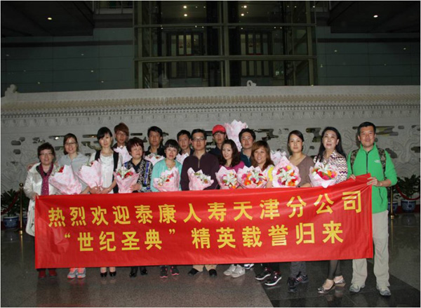 4月26日晚北京首都机场,参加泰康人寿第十三届“世纪圣典”的天津分公司业务精英伙伴在黄开琢总经理的带队下,从南非载誉归来!
