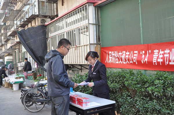 5月5日,人保财险交通支公司组织青年员工,深入社区开展保险业务咨询活动,帮助周围群众深入了解财产保险知识,解答群众问题。