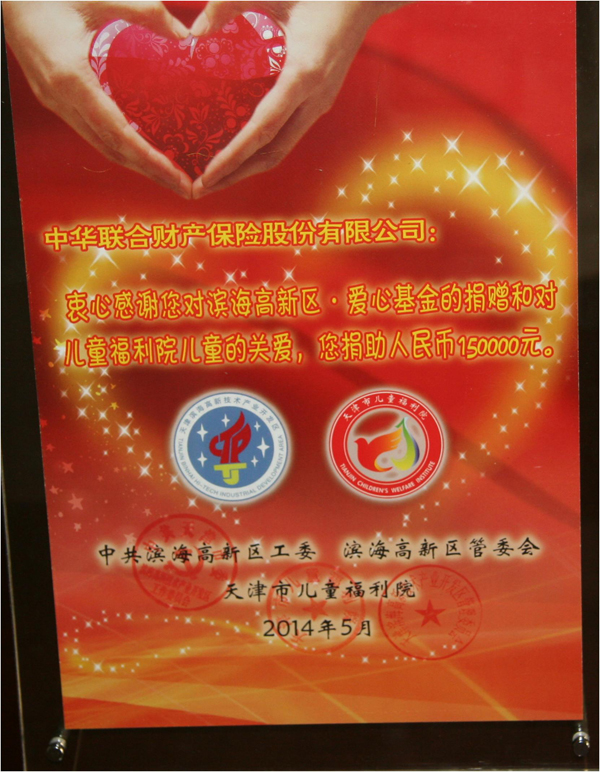 2014年5月30日,在“六一”国际儿童节到来之际,天津分公司总经理韩军代表分公司再次参加天津滨海高新区“慈善爱心团走进儿童福利院”活动,并捐善款15万元。这是天津分公司连续第三年参加爱心捐助活动,共计捐款32万元。滨海高新区工委、管委会领导、市民政局、社会福利事业管理处及滨海高新区企事业单位近百人参加了活动。