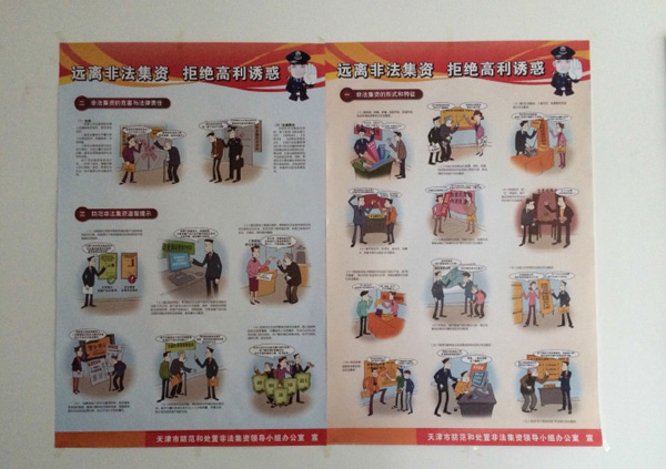二是精心组织,引导群众建立防范意识。与天津保监局积极沟通,领取并发放防范打击非法集资宣传材料,各级机构均在职场显著位置悬挂“提高风险防范能力,自觉抵制非法集资”的宣传条幅,设置宣传资料发放台,向客户宣传防范打击非法集资的相关知识,起到较好的社会宣传效应。