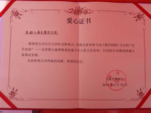 本次活动生命人寿天津分公司获得由主办方《城市快报》颁发的“爱心证书”奖项,大大鼓励了生命人寿投身社会公益事业的信息和动力。生命人寿天津分公司将进一步开展VIP客户活动及公益宣传活动,不断释放生命人寿的公益魅力,以实际行动推动津城公益事业发展。(文/生命人寿天津分公司 刘佳)