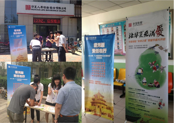 公司在7月8日设立总经理接待日,主动接待来访客户,倾听客户诉求,了解客户意愿,耐心讲解保险的意义与功用及相关知识,获得客户的认可和好评。同时,积极配合“7.8全国保险公众宣传日”活动宣传,在职场及服务场所等进行张贴宣传“爱无疆,责任在行——2014年7月8日全国公众宣传日”活动宣传海报、横幅、LED屏滚动播放及公司晨会宣导等方式,统一的宣传形象,提高客户接受和信任程度,助力行业公众宣传日活动开展。活动期间,公司工作人员冒着烈日在多个活动场所主动宣传保险知识,同时向参与活动的人员赠送最高保险金额20万元的“华夏宝”意外伤害保险,保障范围涵盖飞机、火车、客车及普通意外伤害,受到客户广泛好评。