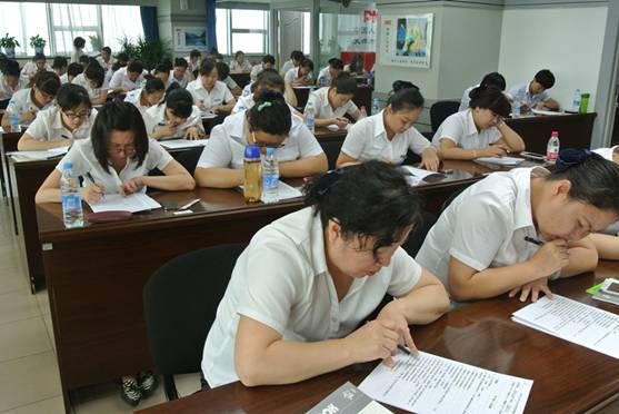 7月19日,人保财险天津市分公司出单中心举办2014年度定级考试考前培训。培训开始之前,全体参训员工参加了定级模拟考试。