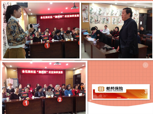 为了充分体现“服务社会、回馈社会”的保险精神,都邦财产保险天津分公司津港支公司于1月15日联合津南区“金石里”社区服务中心为社区居民举办了“防火、防盗、防诈骗,注意冬季安全”的“都邦杯”主题知识竞赛。