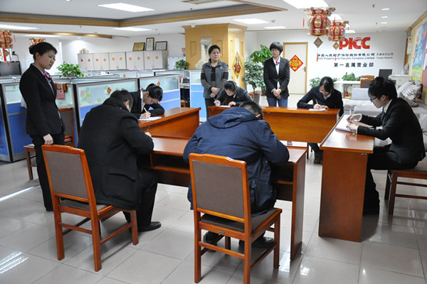 2015年3月6日晚间进行了面对面培训,9日晚组织考试。考试包括笔试和上机两个部分,涉及到车险出单技能、险种条款解读、理赔后续服务、员工仪容仪表规范、驻店员工作流程、展业能力考察、对本店年度任务和店内人员的了解等等,全面考察工作切入情况和对工作的态度和理解程度。
