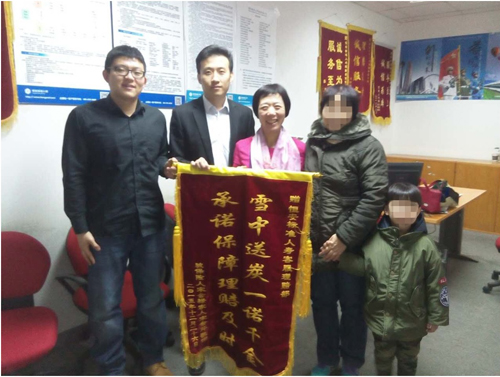 2015年的最后一个工作日,冒着严寒,被保险人宋先生的姐姐宋女士受全家人之托将印有“雪中送炭一诺千金,承诺保障理赔及时”的锦旗及一封沉甸甸的感谢信送到了天津分公司客户服务部,对公司及时理赔表达感谢。