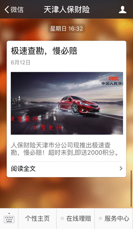 6月12日,“天津人保财险”微信公众号正式推出微信查勘“慢必赔”服务,此项服务进一步契合了新生代人群快节奏的生活方式,为微信绑定客户提供更多便利。本次微信服务承诺的推出具有里程碑意义,是天津市分公司从价格战转型到服务战的第一步。