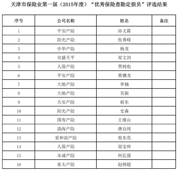 按照《天津市保险业第一届(2015年度)“优秀保险查勘定损员”评选办法》要求,根据初审和复审结果,确定下列16人为天津市保险业第一届(2015年度)“优秀保险查勘定损员”候选人(名单附后),现予以公示。公示时间:2016年6月25日—6月29日,如有异议,请向天津市保险行业协会反映,监督电话:022-23304432。