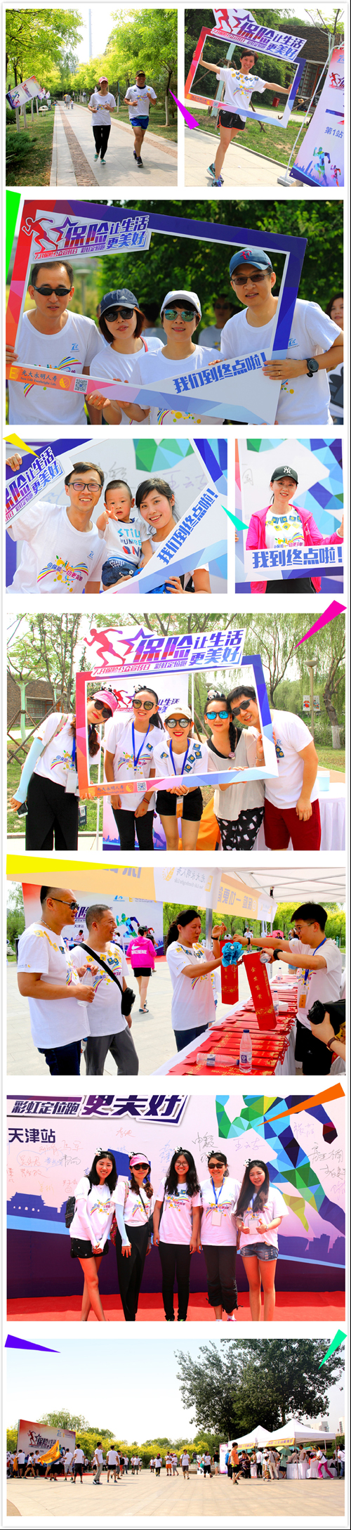 六月的天津尽管已是艳阳高照、但丝毫不影响参加此次活动伙伴的热情。26日一大早,大家身穿印有“保险让生活更美好”的彩虹T恤,早早地来到活动现场,进行赛前的热身活动。9点整,天津分公司总经理马军鸣枪开跑,参赛伙伴化身运动健将冲出起跑线,奔跑在既定的跑道上,并按照活动规则在四个加油站点集齐赛程规定的贴纸,既完成了五公里的彩虹跑任务!到达终点后大家兴高采烈的兑换礼品、用创意拍照版拍照,成为现场一道亮丽的风景线!