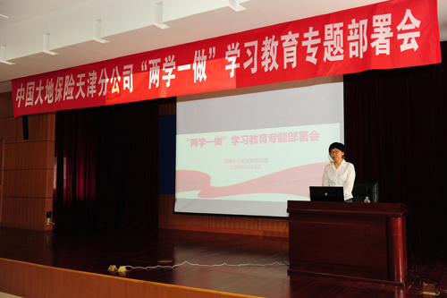 为深入学习贯彻习近平总书记系列重要讲话精神,推动全面从严治党向基层延伸,巩固拓展党的群众路线教育实践活动和“三严三实”专题教育成果,进一步解决党员队伍在思想、组织、作风、纪律等方面存在的问题,保持发展党的先进性和纯洁性,严格落实“两学一做”学习教育各项工作要求,中国大地保险天津分公司于2016年6月18日上午组织公司全体党员开展“天津分公司‘两学一做’学习教育专题部署会”,对天津分公司“两学一做”实施方案进行宣导,并邀请天津市委党校教授为全体党员和积极分子开展题为“深入学习习近平总书记系列讲话精神”的专题授课。