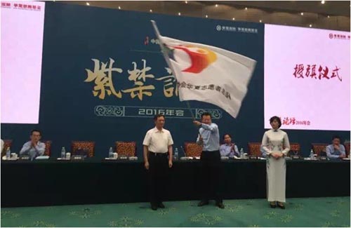 6月23日下午,华夏保险“紫金论坛2016年会”在北京钓鱼台国宾馆隆重召开。会上,中华志愿者协会会员部主任范梦文宣读《关于申请成立中华志愿者协会华夏志愿者总队的批复》。中华志愿者协会秘书长宋志强同志向华夏志愿者总队授旗,总公司党委书记、总裁赵子良同志代表十万华夏志愿者接过这象征公益事业责任与使命的旗帜并庄严宣誓,十万华夏人成为光荣的“中华志愿者”,华夏保险的公益行动和志愿服务将进入更加规范、健康、有序发展的新阶段。