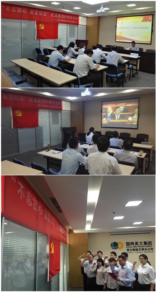 2016年7月1日是中国共产党成立95周年纪念日,英大财险天津分公司(以下简称“分公司”)开展以“不忘初心 坚定信念”为主题纪念活动,活动涵盖亮身份亮承诺、向党旗宣誓、观看中央建党95周年暨先进表扬大会现场直播、支部书记讲党课等内容,聆听了习近平总书记重要讲话,以实际行动向建党95周年献礼。