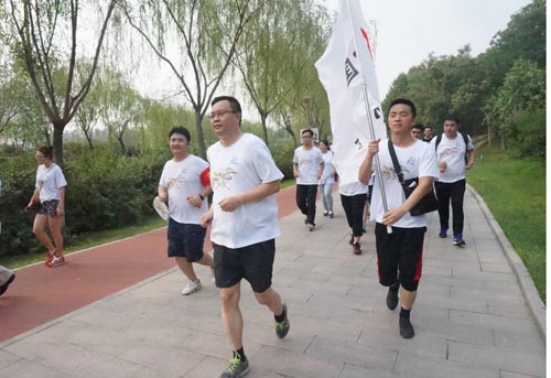 人保财险天津市分公司高健总经理带领20名员工沿南翠屏公园起跑,充分展示了保险人健康向上的精神风貌。同时也希望通过奔跑的方式,让更多人关注健康、关注保险。(人保财险天津市分公司)