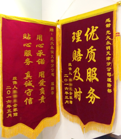 光大永明人寿保险公司自开业以业,一直秉承“诚信为本、客户至上”经营理念,为广大客户提供优质、便捷、高效的服务得到新老客户的广泛好评与信任,理赔后客户赠送锦旗、再度签单的实例屡见不鲜: