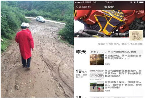 张晶、董黎明,非车分部财产工程险组组长及案件处理人员,7月19日山西晋城我司承保某客户出险,由于该客户临近续保,他们二人开车前往进行现场查勘并做风控调查,到达晋城该地已因暴雨多地封锁,二人为尽快赶回天津不畏艰难,坚持上山进行查勘,20日完成查勘后直接赶回天津。但因暴雨,京港澳高速封闭,延误了返程时间,为了保证21日能够投入天津暴雨后的查勘工作,两人没有休息,而是绕行其他高速及国道连夜返回天津,第二天一早即赶到公司参与到天津暴雨的现场查勘中。