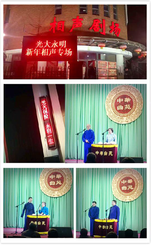 2016年12月28日,光大永明人寿保险有限公司天津分公司城区事业部在中华曲苑举办了“欢声笑语迎鸡年”年终客户答谢活动,天津电视台主持人马小川担任现场主持,著名艺术家田立禾、张文霞、魏文华倾情演绎。丙申之末,以最具天津特色的传统相声、曲艺表演等节目答谢支持光大永明的津门父老和奋战在销售一线的业务伙伴。活动现场高朋满座,共有360余人次到场观看演出。