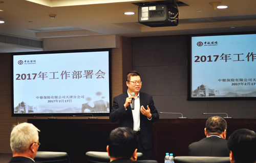 2月17日,中银保险天津分公司2017年工作部署会在中国银行天津分行会议室召开,会议由营销管理部韦巍副经理主持,全体员工参加。此次会议还特别邀请了中国银行天津分行工会常务副主任梁亮、分行党务工作部总经理王骏驰、红桥支行网点主任梁松彬出席并分别针对工会、党务及业务三个方面为分公司员工开展培训讲座。