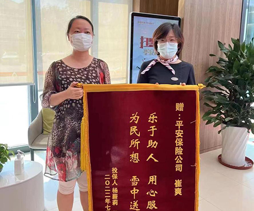 近日,分公司优秀服务顾问崔爽收到客户的感谢锦旗。据了解,两年前的夏天,分公司优秀服务顾问崔爽负责在客服中心帮客户取号的工作。当天杨女士满头大汗地进来寻求帮助,崔爽安抚客户先坐下休息。杨女士表示,自己明天就要离开天津,但是还差一份符合公司要求的保险,可是咨询了很多人和公司都没有找到合适的,还剩下一天时间,客户非常焦急。崔爽在了解客户需求后,虽然并未在寿险发现合适的产品,但联系了养老险和财产险的同事了解情况,终于为杨女士找到了符合条件的产品,并协助其与相关工作人员联系。后来崔爽接到杨女士的电话,表示终于投保成功,解决了自己的燃眉之急,非常感谢平安工作人员耐心、暖心的服务。今年9月初,崔爽再次接到杨女士的电话,表示自己这两年一直在甘肃支教,刚回到天津,一定要当面表示感谢。